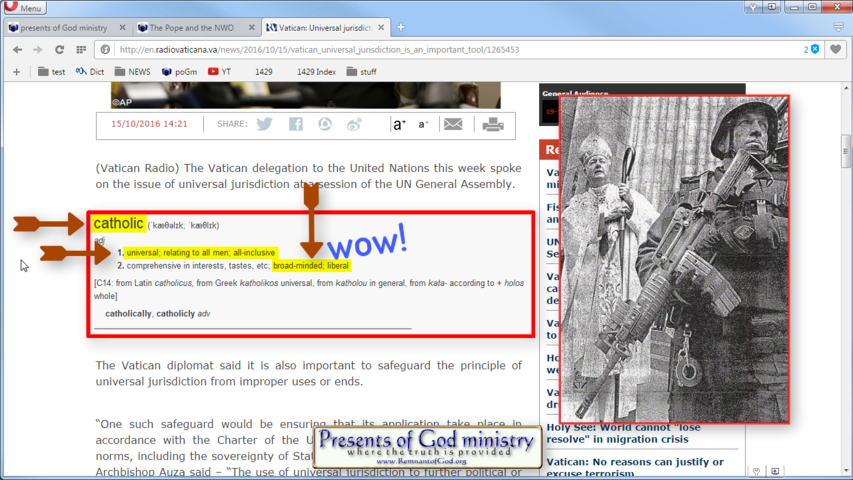 And keep in mind. The website this article was posted on is a Roman Catholic website which has no clue regarding the prophecies of our Lord. They are merely reporting on what they see as an injustice unto all. The Lord has allowed this to be proclaimed in this way so as to lend credence and vindication unto the present truth message His obedient bride has been ordained to proclaim the last few decades. What's very strange here is that they nearly echoed what students of prophecy have been saying all along when they said "they believed in a one-world government that would grow out of the United Nations." One can only wonder if the laughing of the scoffer has finally stopped by now.