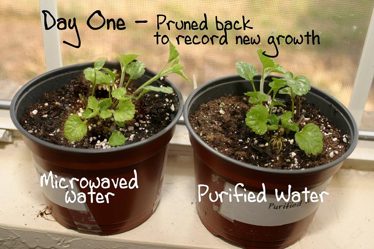 Below is a science fair project that my granddaughter did for 2006. In it she took filtered water and divided it into two parts. The first part she heated to boiling in a pan on the stove, and the second part she heated to boiling in a microwave. Then after cooling she used the water to water two identical plants to see if there would be any difference in the growth between the normal boiled water and the water boiled in a microwave. She was thinking that the structure or energy of the water may be compromised by microwave. As it turned out, even she was amazed at the difference.