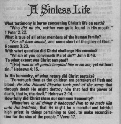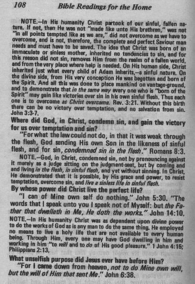 Below is an actual scan of pages 107 and 108 of (the unaltered) version of "Bible Readings for the Home" (Below's excerpt came from Harvestime Books Altamont TN 37301) It shares awesome Truth concerning the sinless life of Jesus Christ. It also shares concrete Biblical evidence as to the humanity of Christ as well. It also confirms the book "Bible readings for the home" has been ALTERED by Roman infiltrators within the SDA church. Match these pages with your copy. Is yours altered?